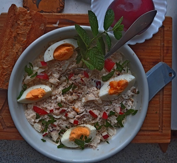 Jednym z takich specjałów jest sałatka z… jajek. To raczej rodzaj pasty do pieczywa. Choć od pasty różni się skrojeniem a nie roztarciem składników oraz pewnym podobieństwem do sałatki majonezowej z jarzyn. Pewnym, bo zawiera ilość jarzyn bardzo ograniczoną. Zdecydowanie jaja są tu podstawą.