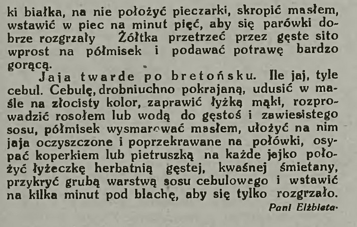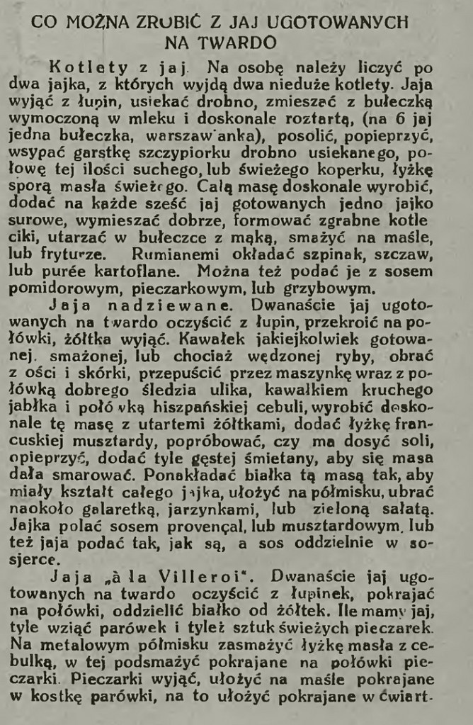 Wykwintną wersję tej sałatki – i to sprzed blisko stu lat! – znalazłam w tygodniku „Bluszcz” z roku 1926. Przepis na nią i kilka dań z jajek, które przytoczę niżej, podała Elżbieta Kiewnarska, czyli popularna przed wojną Pani Elżbieta, autorka książek kulinarnych i felietonów w kilku czasopismach.