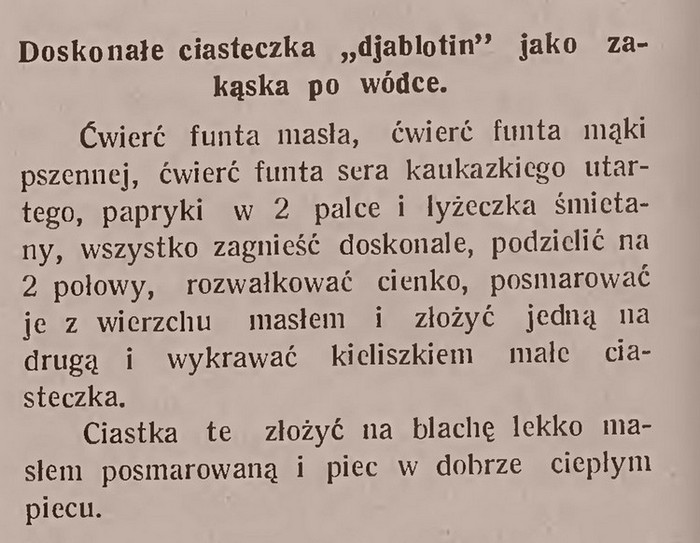 W ukazującym się we Lwowie piśmie „Świat Kobiecy” w roku 1925 także znalazły się podobne słone specjały, podawane na pewno podczas przyjęć koktajlowych, wchodzących w modę w szalonych latach dwudziestych.