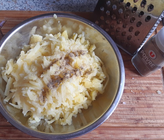 Ziemniaki ugotować na parze w mundurkach. Jeszcze ciepłe obrać ze skórki, zetrzeć na tarce z grubymi oczkami, posypać pieprzem, posolić.