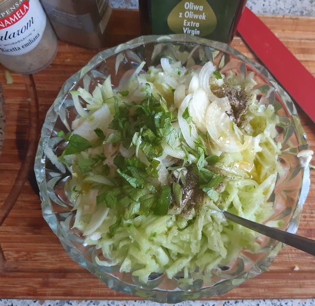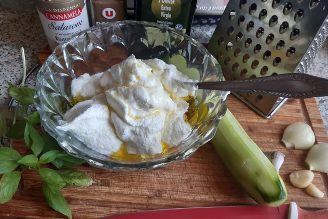 Jogurt wymieszać z oliwa, solą i pieprzem. Ogórek zetrzeć na tarce z grubymi oczkami. Cebulkę i czosnek drobno pokroić, posiekać lub także zetrzeć. Wymieszać.