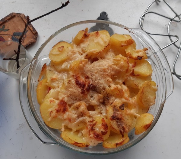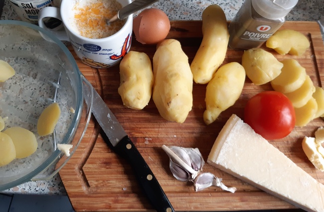 Prostsza do przyrządzenia jest za to każda zapiekanka z ziemniaków. Do mojej dodałam zabłąkanego gdzieś w zapasach pomidora. I dużo czosnku, zdrowego o tej porze jesiennych katarów. Zapiekanki można przyrządzać z ziemniaków surowych – ale wtedy pieką się dłużej – lub z podgotowanych. Często takie zostają jako resztki. Ale muszą to być ziemniaki gotowane całości, nie rozpadające się, bez żadnego sosu. Najlepiej, gdy są gotowane w mundurkach.