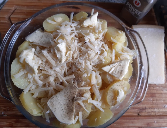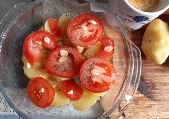 Masłem wysmarować żaroodporną formę. Ziemniaki pokroić w plasterki, podobnie skroić pomidora. Czosnek posiekać. Połowę plasterków ziemniaków wyłożyć do formy, przekładając kawałkami masła, czosnkiem i pieprząc.