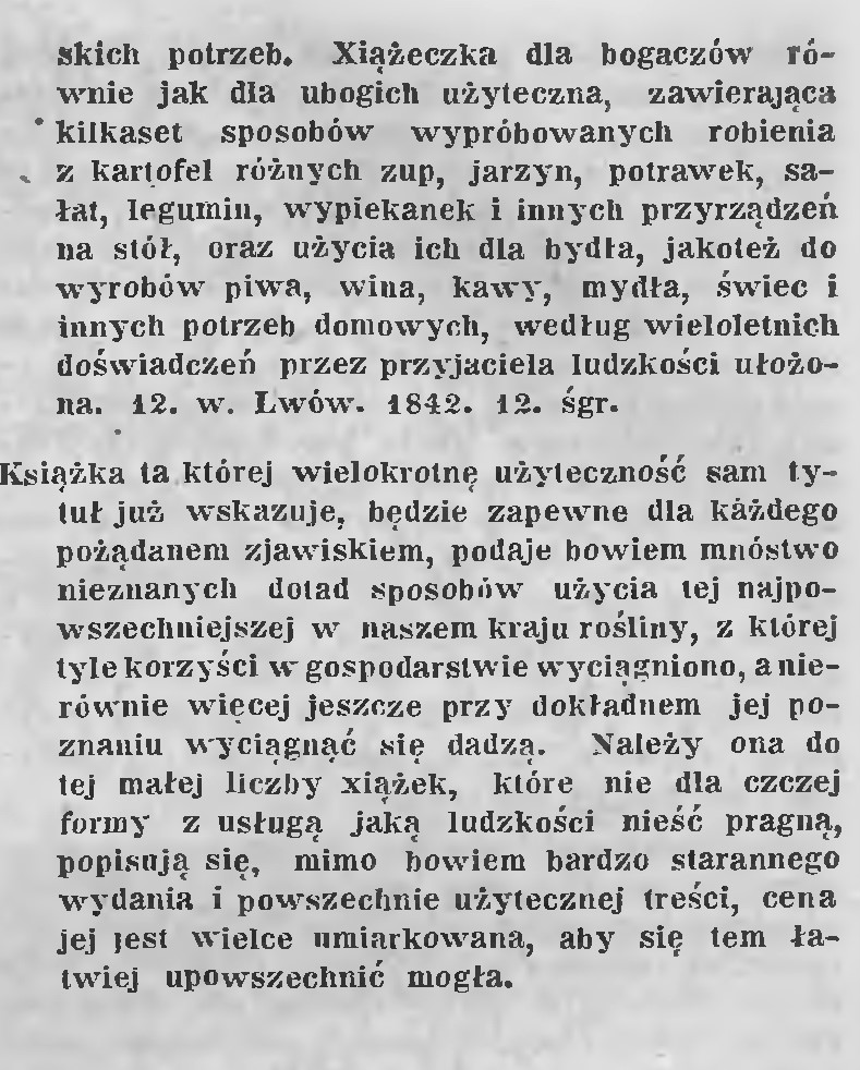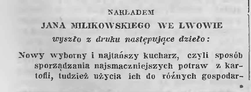 Takich pozycji było wydawanych bardzo wiele. W czasach normalnych, ale także w czasach bardzo złych, gdy pożywienia brakowało, a zakopcowane ziemniaki były ostatnim ratunkiem przed głodem. Przykładem wydawana za zgodą Niemców na potrzeby zamkniętych dzielnic żydowskich „Gazeta Żydowska” (miała stwarzać złudzenie normalności, aż po rok 1942, rok Zagłady). W roku 1940 autorka podpisana inicjałami radziła, jak ziemniaki gotować. Mały tekścik wiele mówi o warunkach życia w gettach (gazetę wydawano w Krakowie, ale kolportowano i w Warszawie).