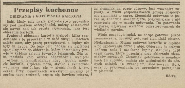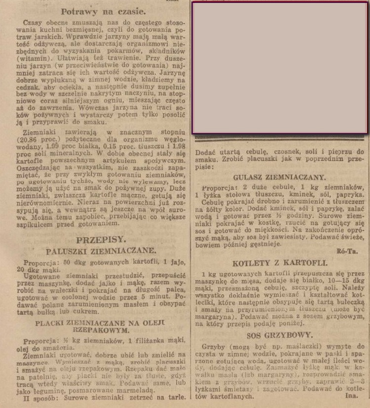 Potraw z ziemniaków z konieczności wyszukiwano i wymyślano wiele, oto niektóre z nich, także proponowane przez dwie autorki podpisane inicjałami (obie współpracowały z gazetą) w roku 1940.