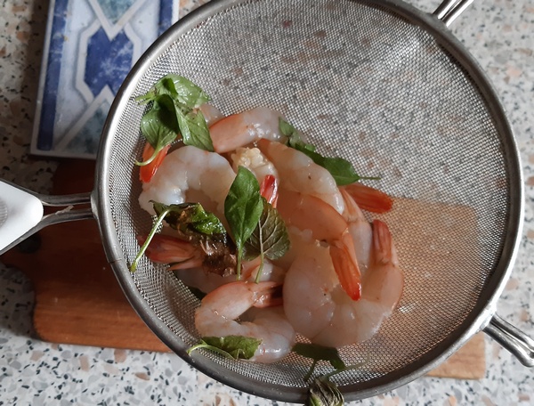 Krewetki rozmrozić, opłukać, wytrzeć do sucha. Posypać listkami świeżej melisy lub mięty. Skropić wermutem, lekko posypać solą.