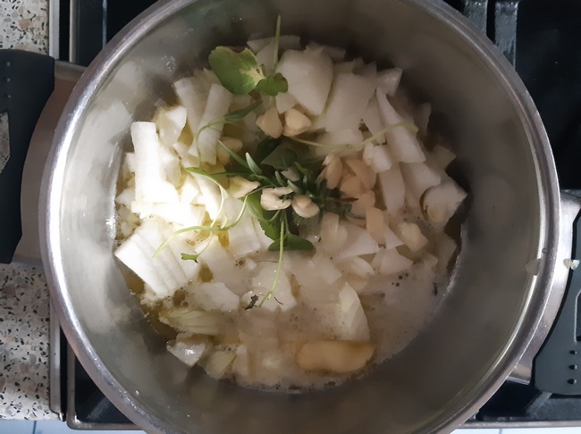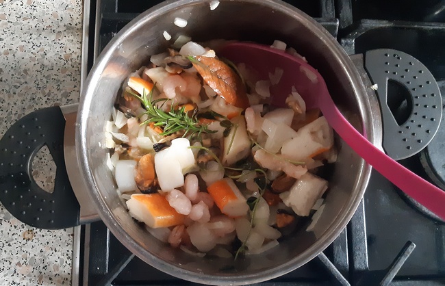 Do garnka dołożyć owoce morza. Wymieszać. Dodać rozmaryn, liść laurowy, kilka ziarenek pieprzu. Dusić ok. 10 minut.