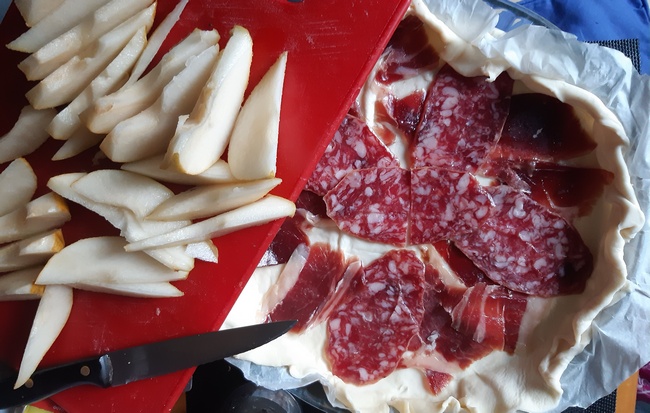 Ciasto przygotować do pieczenia, wyłożyć do okrągłej formy na tartę na papierze do pieczenia. Na spodzie rozłożyć jak najcieńsze plastry wędliny. Na wędlinie ułożyć plasterki gruszek skrojone wzdłuż. Przykryć plastrami sera owczego. Rozłożyć pokruszony ser pleśniowy. Posypać papryką.