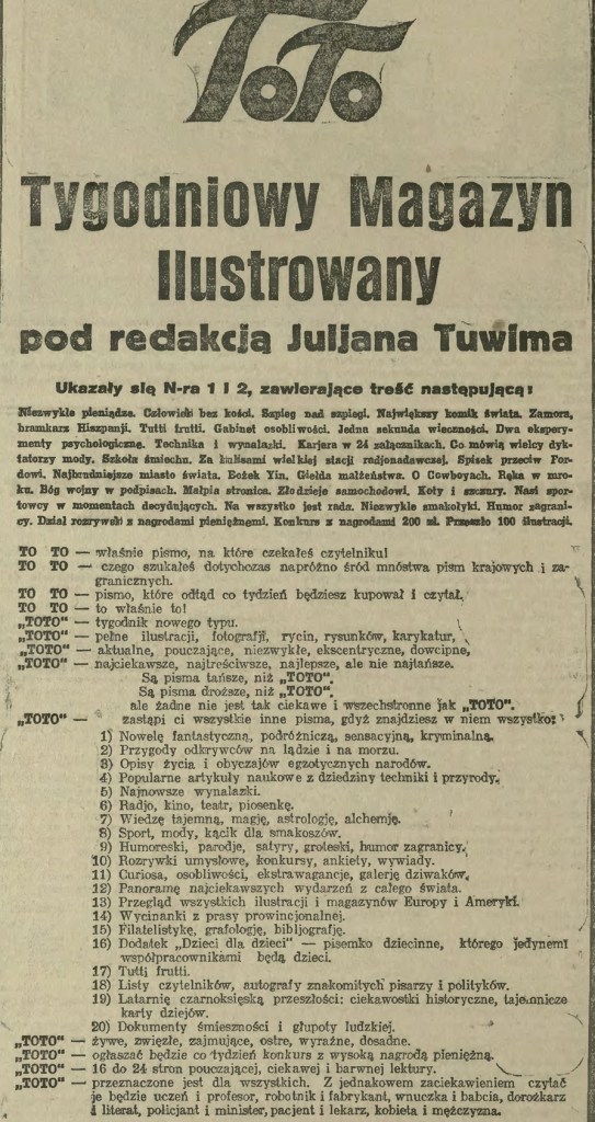 Zamieściło je pismo o dziwnym tytule „To to”. Redagował je sam Julian Tuwim! Poruszało różne tematy, ujęte lekko i ciekawostkowe. O czym pisało? Mówi reklama zamieszczona w IKaCu w roku 1925. Przycięłam ją, aby była czytelniejsza.