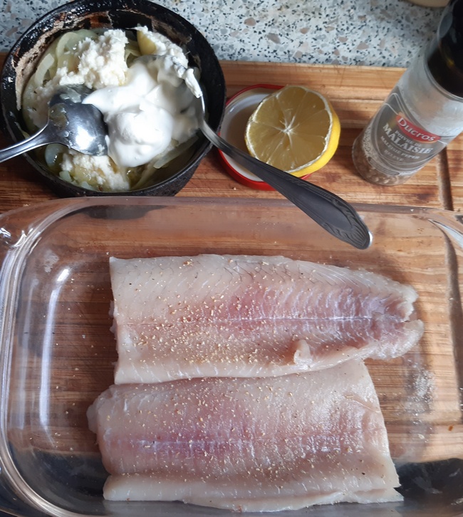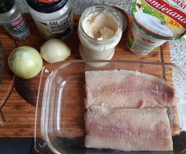 Cebulę nieco przestudzić, wymieszać z chrzanem i śmietaną. Naczynie do zapiekania wysmarować masłem. Ułożyć filety.