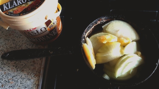 Filety sprawdzić pod kątem ości, nasolić lekko, popieprzyć. Cebulę pokroić w półplasterki, na małym ogniu smażyć ją z masłem, aby zmiękła, lecz nie nabrała koloru.