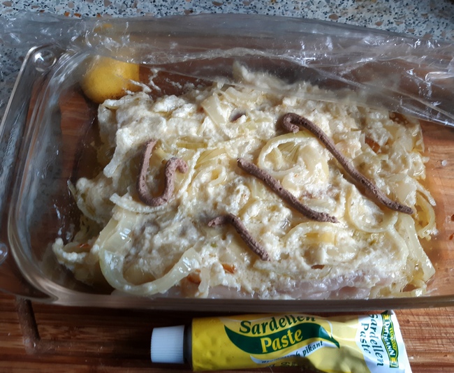 Rybę pokryć mieszaniną cebuli z chrzanem. Wierzch posmarować lekko pastą z sardeli (jeśli jej nie ma, tylko posolić) i popieprzyć.