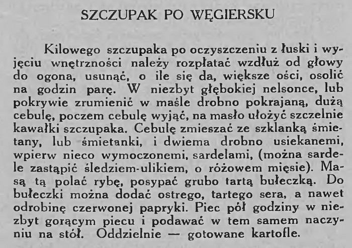Przedewszystkiem [!] pamiętać należy, aby ryby gotować na wielkim ogniu, ażeby nie rozmiękały, a gotowały się szybko, dobroć bowiem ryby zależy na tem, aby była twardą i łupką, do czego bardzo się przykłada prażenie soli mającej być użytą do ich solenia. Pokrajanego w kawałki szczupaka zagotować i na wpół twardego wyjąć z wody. Następnie przygotować parę cebul usmażonych w dużej łyżce masła, zmieszać z tartym chrzanem i tym nałożyć spód rądla [!], potem warstwę ryby, potem znowu chrzanu z masłem i tak do końca. Nakryć i dusić na wolnym ogniu, wstrząsając rądlem, dodać śmietany i znowu dusić, dopóki gotowym nie będzie. Niektórzy nie gotują wcale szczupaka, ale surowego przekładają mieszaniną masła i chrzanu.