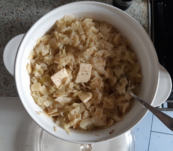 W tym czasie ugotować w osolonej wodzie łazanki, w czasie podanym na opakowaniu. Odcedzić. Wrzucić je do żaroodpornego naczynia wysmarowanego tłuszczem. Gotową, a więc miękką kapustę dodać do łazanek, dokładnie wymieszać. Na wierzchu rozłożyć kilka kawałków masła, posypać pieprzem. Zapiekać pod przykryciem w 160 st. C przez 20–30 minut.