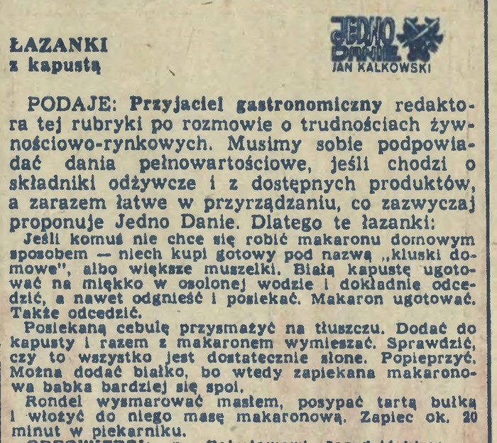 Bardzo podobnie radził przyrządzić łazanki czytelnik rubryki „Jedno danie” w „Przekroju” w smutnym roku 1980.