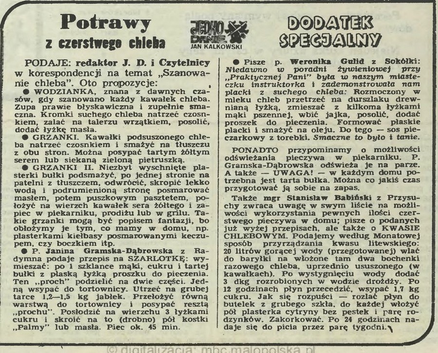 A ten sam „Przekrój” z nieszczęsnego (kto przeżył, wie, o czy mówię!) roku 1980 potraktował temat szerzej. Podał potrawy z suchego pieczywa, nie tylko ze słodkiego ciasta, ale także z chleba. Pożyteczne i dzisiaj!