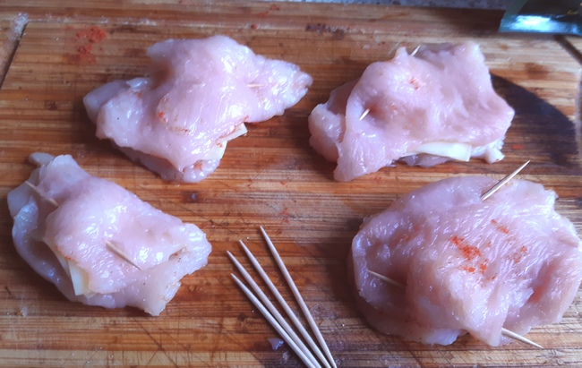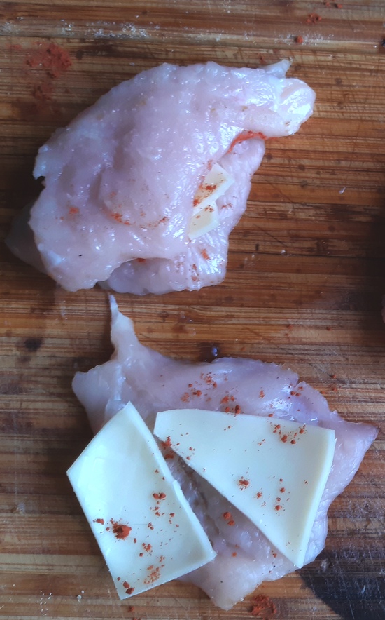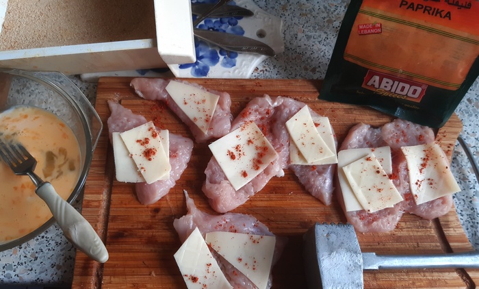 Mięso pokroić na kotlety nieco grubsze niż zwykle, każdy przekroić w poprzek na dwie części złączone z sobą. Rozłożyć je i lekko rozbić (można nasadą noża). Na każdą połówkę nałożyć ser, posypać papryką.
