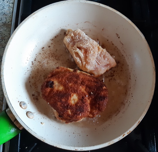 Panierować w mące, a następnie w roztrzepanym jajku (można z odrobiną mleka) i tartej bułce, lekko ją dociskając. Na patelni rozgrzać olej lub klarowane masło. Smażyć kotlety z obu stron.