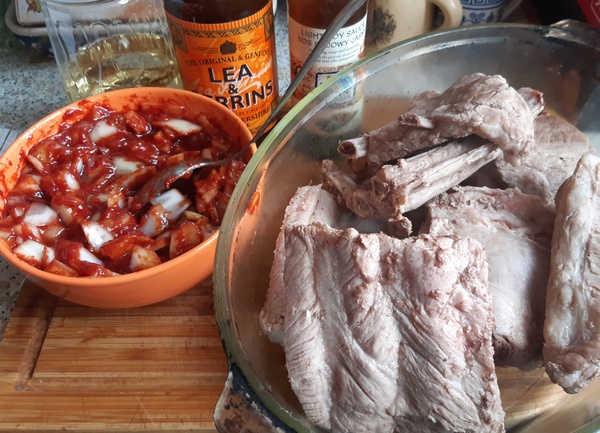 Żeberka pokroić na porcje. Zagotować lekko osoloną wodę, wrzucić żeberka, obgotowywać 10–15 minut, wyjąć (wywar zostawić do ugotowania kapusty). Cebulę pokroić w drobną kostkę. Wymieszać ją z pozostałymi składnikami marynaty: olejem, sosami Worcestershire i sojowym, koncentratem pomidorowym i miodem.