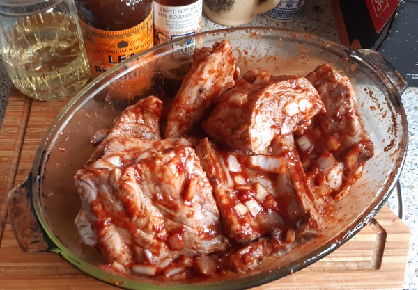 Marynatą pokryć żeberka ze wszystkich stron; można ją wetrzeć. Trzymać pod przykryciem co najmniej godzinę (można zostawić na noc).