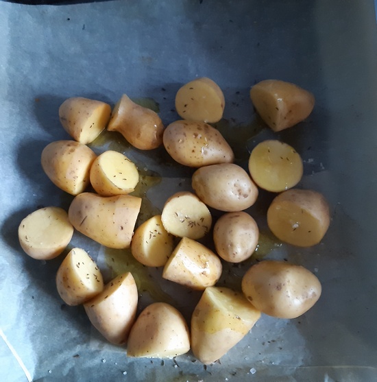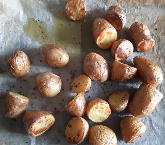 Ziemniaki przekroić na pół (zwłaszcza te większe), skropić oliwą, posypać kminkiem, rozmarynem i grubą solą. Piec ok. 1/2 godziny (nawet do godziny) w 210 st. C.