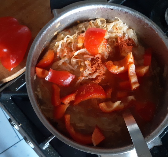 Kapustę odcisnąć tylko wtedy, gdy jest bardzo kwaśna. Nie płukać. Zalać wodą, wrzucić liść laurowy, posypać kminkiem (dobrą łyżką, jeśli lubimy), gotować co najmniej pół godziny. Paprykę oczyścić, pokroić w kawałki, dodać do kapusty, gotować dalsze pół godziny. Cebulę pokroić w półplasterki, zeszklić w oleju, dodać mąkę, zasmażyć aż lekko się zazłoci. Zaprawić kapustę. Przyprawić papryką sypką i do swego smaku ostrą pastą z papryki. Pogotować 5–10 minut.