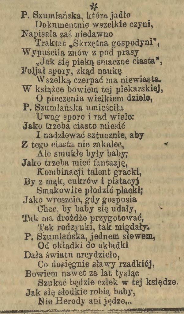 Jak zimowe menu wyglądało dawniej? Zerknijmy na koniec wieku XIX. W roku 1881 ukazała się książka kucharska kolejnej, po najsławniejszej Lucynie Ćwierczakiewiczowej, adeptki sztuki kulinarnej, dzisiaj już nie tak sławnej Pauliny Szumlańskiej. A przecież w swoich czasach była tak znana, że „Kurier Warszawski” w roku 1894 opisał jej kulinarne dzieło w okazjonalnym wierszyku. Był zapewne związany z ukazaniem się kolejnego wydania owej „Skrzętnej gospodyni”. Pierwsze wydanie tej książki w „Kurierze Warszawskim” opisano tak (zachowuję pisownię oryginału): „Ciągle wzrastająca u nas drożyzna niemało przyczynia kłopotu tam szczególniej, gdzie stały dochód na utrzymanie domu posiadany czyni koniecznem zachowanie jaknajwiększej oszczędności w wydatkach obok niespuszczania z uwagi tego nieodzownego obowiązku, że pożywienie powinno być posilne i zdrowe! Jeżeli taki stan rzeczy daje się uczuć nawet doświadczonym gospodyniom, to dla młodych, rozpoczynających swój zawód mężatek stanowi on nieraz bardzo ciężkie zadanie.
