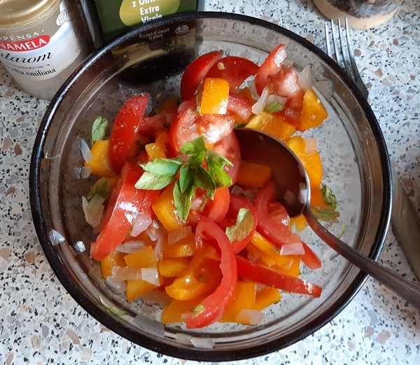 Cebulę pokroić w kostkę, zblanszować przez 2 minuty lub tylko sparzyć. Paprykę umyć, przekroić na pół, oczyścić z nasion i błonek, pokroić w paski, wymieszać z listkami bazylii. Pomidory po umyciu pokroić w półplasterki.