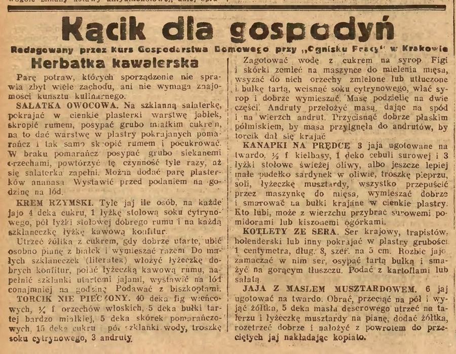 Kolejna propozycja pochodzi z zasłużonego „Tygodnika Mód i Powieści”, który pod rożnymi nazwami ukazywał się od połowy wieku XIX, a w roku 1913, z którego przepis pochodzi, zmieniał nazwę na „Nasz Dom” i, niestety, chylił się ku upadkowi. Rok później, pewnie częściowo i za sprawą wojny światowej, przestał się ukazywać.
