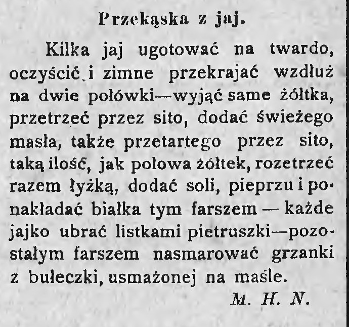 Kto nie ma sosów kanaryjskich ani czasu czy ochoty na ich przygotowanie, niech się nie martwi. Jajka można faszerować także innymi ciekawymi składnikami. Garść pomysłów historycznych nam w tym pomoże. Na początek pomysł, jaki przedstawił lwowski „Świat Kobiecy” w roku 1925.