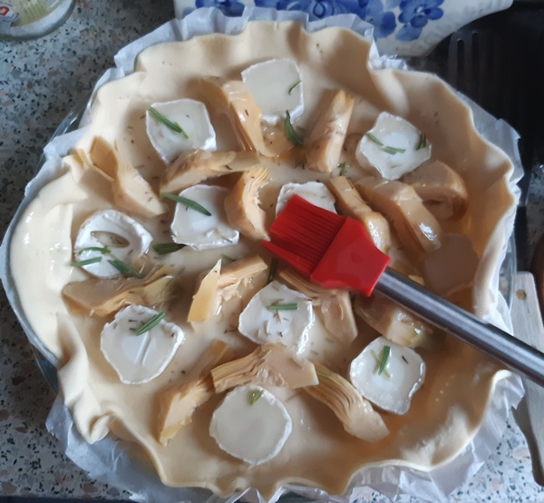 Piekarnik nagrzać do 200 st. C. Ciasto francuskie wyjąć, po kilku minutach rozwinąć. Na papierze, w który było owinięte wyłożyć na formę do pieczenia. Nakłuć widelcem. Karczochy wyjąć ze słoika, oliwę zachować. Posmarować nią spód tarty,