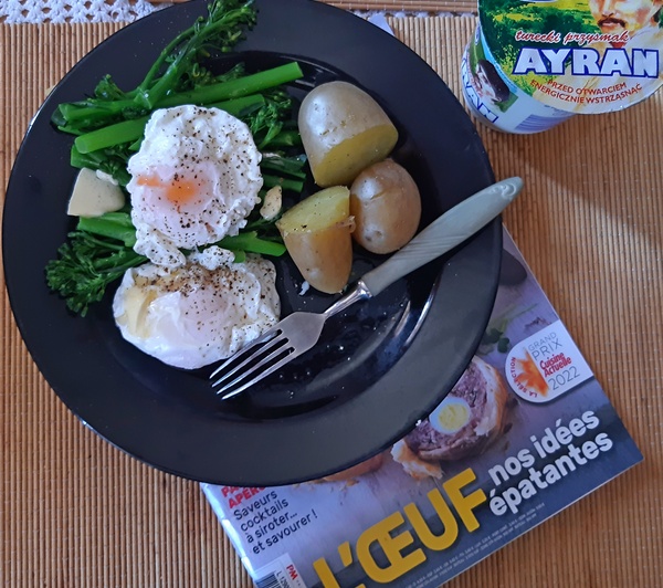 Te jajka połączyłam z jarzynką wyjątkowo smaczną o tej porze roku – z brokułami szparagowymi.