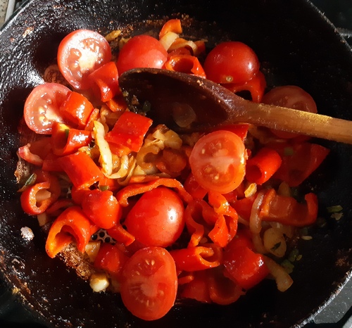 Dorzucić połówki pomidorków, wymieszać, smażyć 5–8 minut razem, posypane papryka słodką i ostrą.