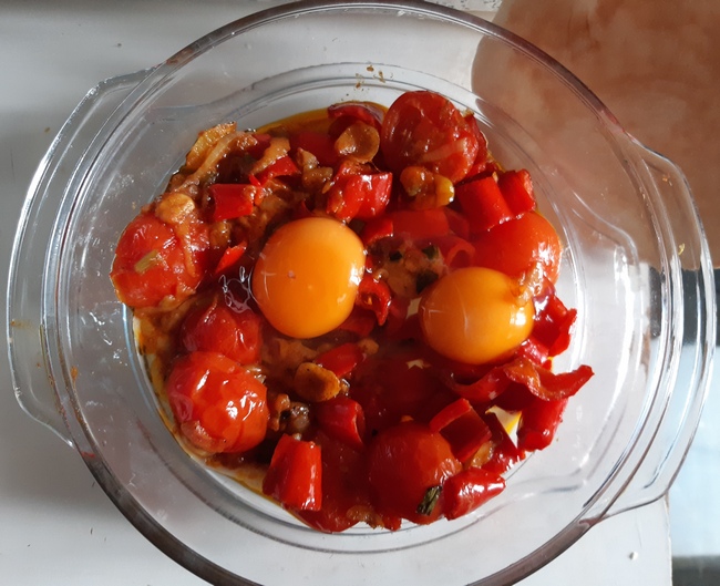 Warzywa przełożyć do naczynia żaroodpornego. Wbić na nie jajka (aby nie rozbić żółtek, warto je wbijać nie od razu do potrawy, lecz najpierw na spodeczek).