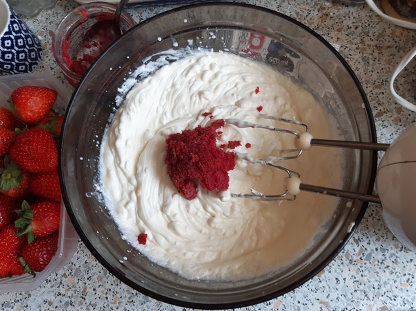 Śmietanę kremówkę ubić dodając stopniowo cukier. Połączyć ją z mascarpone. Dołożyć przecier z róży, ubić przez chwilę razem, aby go całkowicie rozprowadzić.