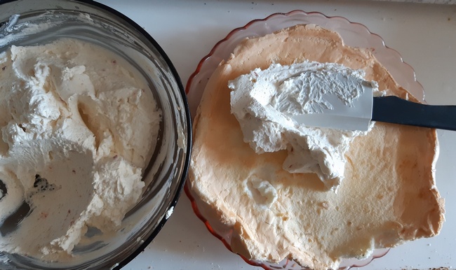Na papierze do pieczenia narysować kółka takie, jakiej średnicy ma być tort. Wyłożyć na nie ubitą pianę.