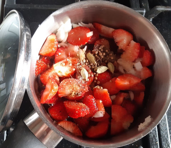 Cebulkę lub szalotkę drobno pokrojoną, przekrojone truskawki zalać octem i 50 ml wody. Dosypać cukier.