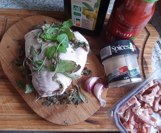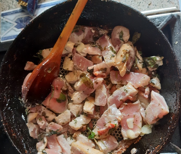 Mięso natrzeć ziołami, skropić oliwą, lekko posolić, odstawić na kwadrans lub dłużej (można to zrobić poprzedniego dnia i trzymać w lodówce). Mięso indyka pokroić w kostkę. Na patelni do duszenia potraw podgrzać 2 łyżki oliwy, zasmażyć w niej boczek, dodać mięso, smażyć mieszając aż się lekko przyrumieni. Na końcu wmieszać posiekany czosnek (kto lubi, daje więcej niż 2 ząbki).