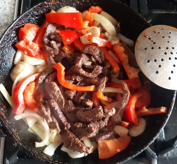 Cebulę pokroić w półplasterki, oczyszczoną paprykę w paski, pomidory na kawałki. Na patelni rozgrzać olej, na mocno rozgrzanym obsmażyć paski mięsa, aby się zrumieniły. Mocno obsmażone mięso wyjąć, dolać łyżkę oleju, wrzucić cebulę.