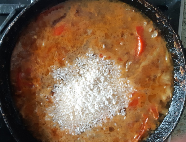 Zalać bulionem. Dodać dobrą łyżkę pasty paprykowej. Dusić aż mięso zmięknie, w razie potrzeby dolewać wody. Gdy mięso zacznie mięknąć, wyspać ryż.
