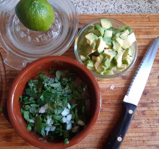 Awokado obrać, pokroić w drobną kostkę, obficie skropić sokiem wyciśniętym z cytryny. W taką samą kostkę pokroić obrane ogórki (jeśli wodniste, środki usunąć). Podobnie pokroić cebulki. Czwartą część awokado i ogórka pozostawić. Miętę, natkę pietruszki i jedną cebulkę posiekać drobno, jak lubimy.