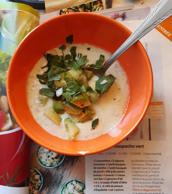Składniki tego kolejnego, nazywanego we francuskim piśmie kulinarnym, jak pisałam, gaspacho, bardzo mnie zdziwiły. Okazały się znakomitym połączeniem. Nietypową zimną zupą moi goście się zajadali, posmakowała nawet przyjaciółce deklarującej żywą niechęć do zup owocowych. A tu owoce są! Choć w towarzystwie warzyw, co nie pozwalało im się szarogęsić. Przepis oryginalny nieco zmieniłam.