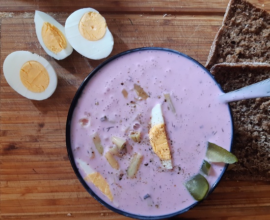Wygotować smak z buraka i jarzyny, do gotowania, dodać łyżkę octu. W wazie rozbija się litr mleka kwaśnego z kwaśną śmietaną i żółtkiem, następnie mięszając ciągle, zalać gotującym smakiem. Dodać garstkę kopru siekanego, kwaśnego ogórka i drobno usiekane twarde jajko.