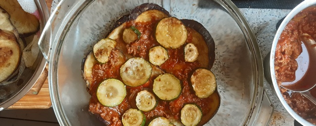 Bakłażany pokroić w cienkie plastry, posolić, odstawić na godzinę, odcisnąć z płynu, osuszyć. Cukinie pokroić w plasterki tej samej grubości, podobnie cebulę. Czosnek posiekać lub zmiażdżyć. Bakłażany oraz cukinie obsmażyć na oliwie. Odkładać na papier absorbujący tłuszcz.