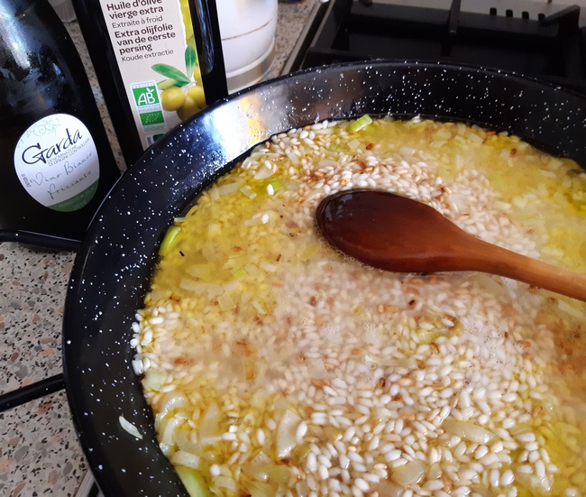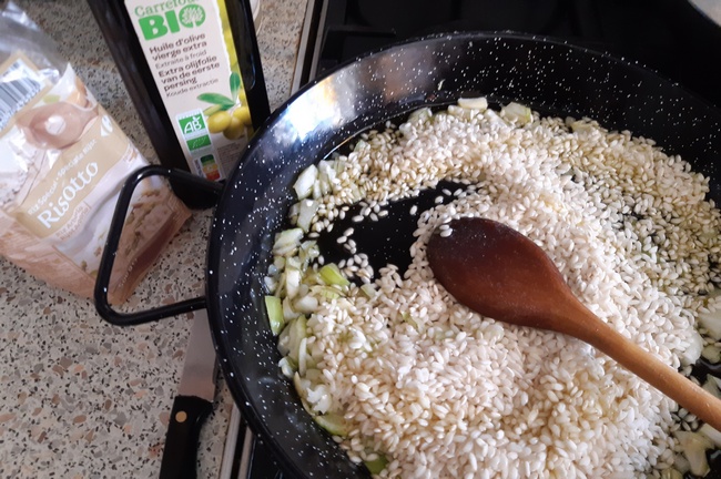 Na szerokiej patelni rozgrzać 2 łyżki oliwy. Wrzucić pokrojoną w drobną kostkę cebulę, zeszklić ją, nie rumienić. Dodać ryż, smażyć mieszając, aby każde ziarenko pokryło się tłuszczem.
