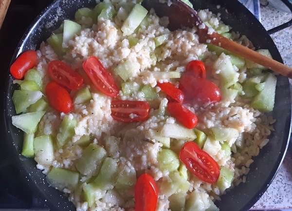 Gdy ryż wchłonie wino, smażyć dolewając po trochu bulion, aby ryż był nim przykryty. Potrwa to ok. 20 minut. Pod koniec, gdy ryż zacznie mięknąć, dodać kilka kawałków masła i posiekane igiełki rozmarynu. W tym czasie pokroić w kostkę miąższ melona, a pomidorki na pół.