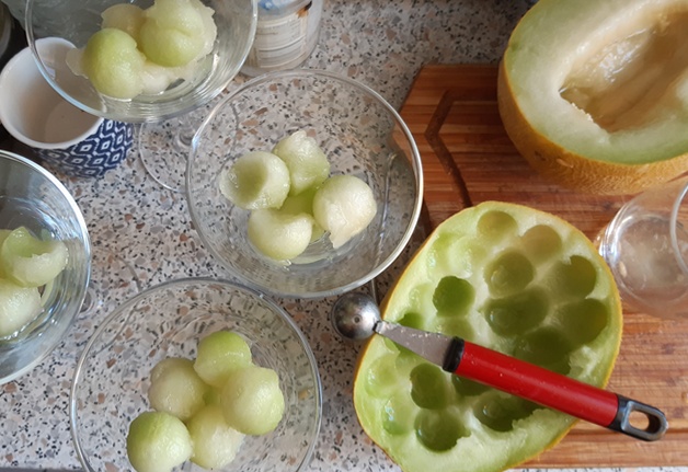 Z melona wyciąć kuleczki specjalną łyżeczką. Można też miąższ pokroić w kostkę o podobnych rozmiarach. Wyłożyć do szklaneczek, kieliszków lub małych salaterek.