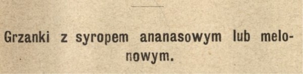 Bułkę białą, dużą, montową, pokrajać w plasterki. a skrawając ostrym nożem skórkę, formować małe trójkątne grzanki. Usmarzyć [tak pisano!] je na patelni, na klarownem koniecznie maśle, przy wolnym ogniu – nie można pod blachą, bo stwardnieją i uschną zbytecznie. Usmarzone ułożyć na okrągłym półmisku w okrąg ponakładać po plasterku ananasu, lub białych ananasowych truskawek, przykryć. każdy drugą grzanką i postawić na ciepłym trzonie. Podając wlać w środek między grzanki sos następujący: pół łyżki młodego masła zagotować, w gotujące wsypać pół łyżeczki kartoflanej mąki, rozprowadzić do właściwej gęstości syropem ananasowym lub truskawkowym białym, wymieszanym z kieliszkiem dobrego araku i ciepłe podać na stół. W braku ananasu można go zastąpić melonem; zrobiwszy gęsty syrop, wrzucić trochę pokrajanego ananasowego melonu. Gotować z pół godziny, aby cały aromat wyszedł, a następnie użyć do sosu.