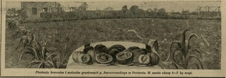 Przed wojną melony w handlu i na stołach bywały obecne, choć nie powszechnie. Przypomnę, jakie kupowano, opisywano, co z nich robiono. Sięgam do „Kuriera Warszawskiego” z roku 1938. Nieoceniona Pani Elżbieta, czyli Elżbieta Kiewnarska, opisała pożytki z melona. Już wtedy były rozmaite ich gatunki. Niektóre uprawiano na południowo-wschodnich Kresach Rzeczypospolitej, w okolicach słonecznych Zaleszczyk. Choć nie tylko, na co wskazuje fotografia z roku 1936 z „Ilustrowanego Kuryera Codziennego”.