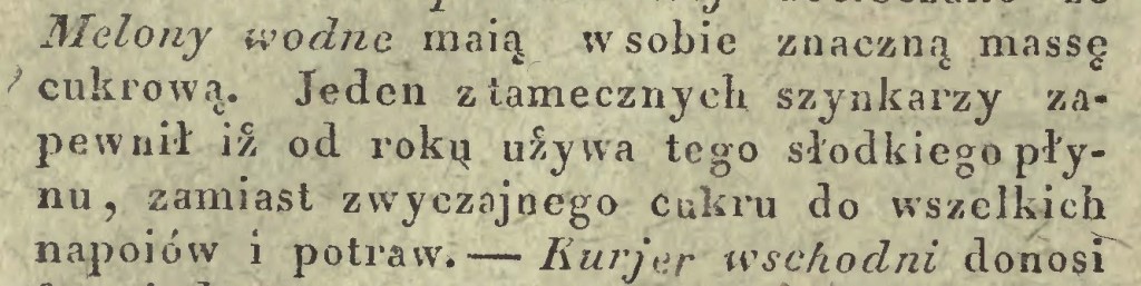 A żeby nie kończyć ze smutkiem, podaję jeszcze jedno zastosowanie, tym razem soku melonowego. Urocza notka jest najstarszą z przedstawionych, pochodzi z „Kuriera Warszawskiego” z roku 1829. Kontynuujmy tradycję jedzenia melonów, nie zapominajmy o nich.